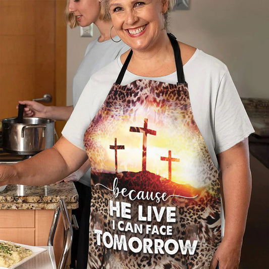 Christianartbag Apron, Because He Lives I Can Face Tomorrow, Leopard Pattern And Three Cross, Apron for Women, Gift For Women, Christmas Gift,