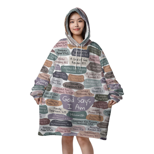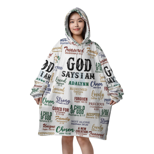 Christianartbag Hoodie Blanket, GOD Says I Am Personalized Hoodie Blanket, Flannel Fleece Hooded Blanket with Pocket, CABHB01071023.