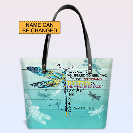 Personalized Leather Tote Bag with Bible Verses – I Am The Storm - Dragonfly | CHRISTIANARTBAG Leather TOTE Bag