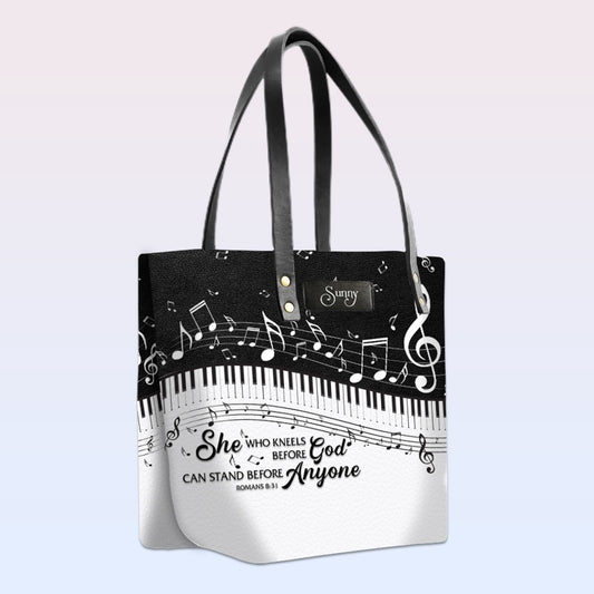 Personalized Leather Tote Bag with Bible Verses – She Who Kneels Before GOD Can Stand Before Anyone Romans 8 31 | CHRISTIANARTBAG Leather TOTE Bag