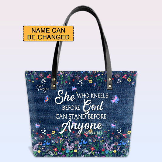 Personalized Leather Tote Bag with Bible Verses – She Who Kneels Before God Can Stand Before Anyone | CHRISTIANARTBAG Leather TOTE Bag