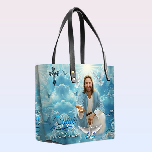 Personalized Leather Tote Bag with Bible Verses – Come to me, all who are weary, and I will give you rest, Matthew 11 28 | Custom Name | CHRISTIANARTBAG Leather TOTE Bag