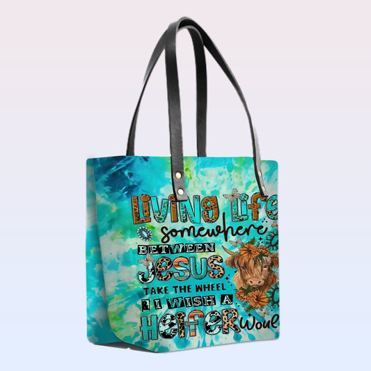 Personalized Leather Tote Bag with Bible Verses – Living Life Somewhere Between Jesus Cow | CHRISTIANARTBAG Leather TOTE Bag