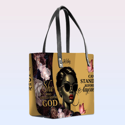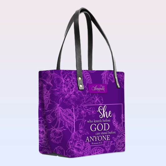 Personalized Leather Tote Bag with Bible Verses – She Who Kneels Before God Can Stand Before Anyone - Elegant & Empowering | CHRISTIANARTBAG Leather TOTE Bag