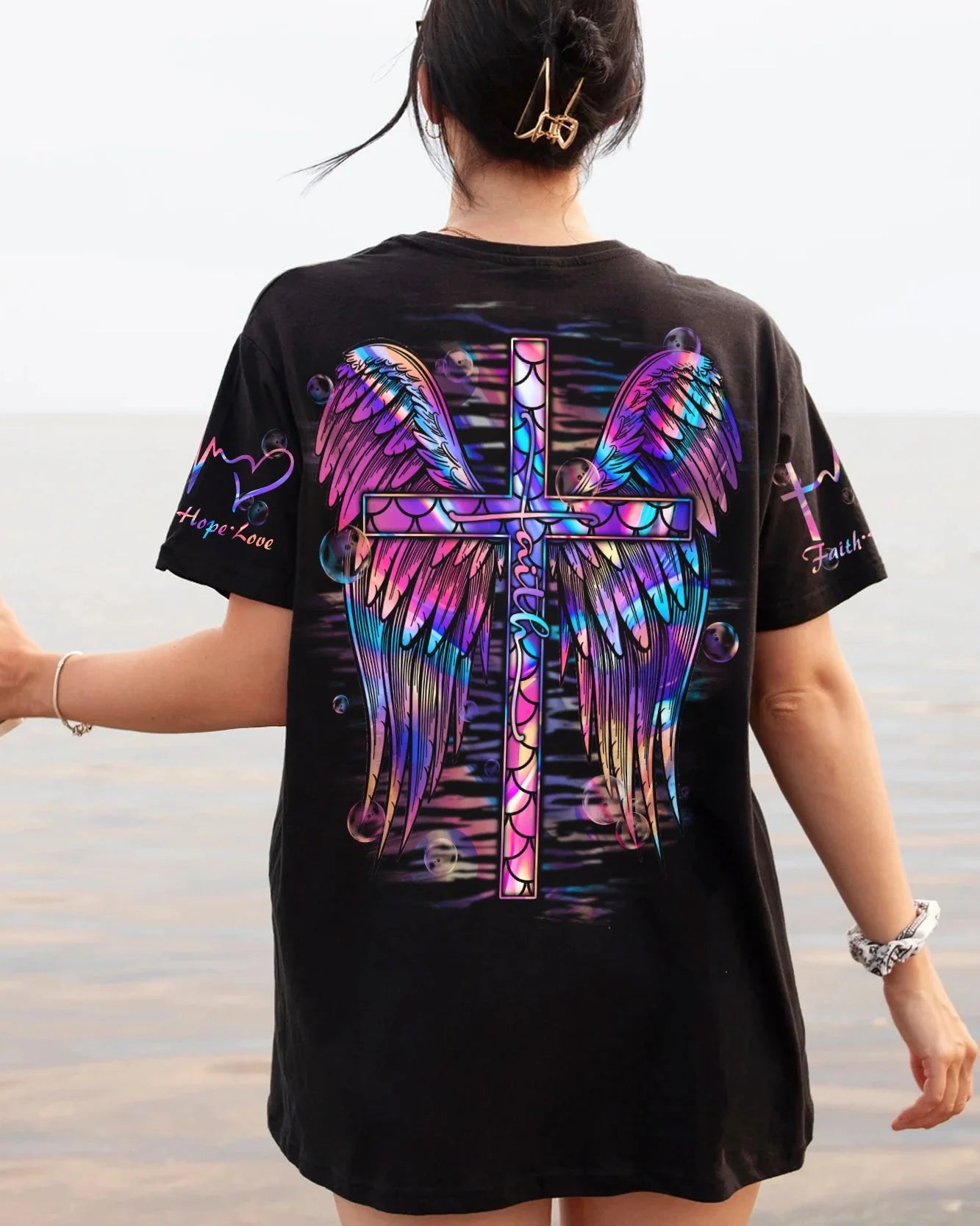 Christianartbag 3D T-Shirt For Women, Faith Cross Wings Mermaid Hologram,Christian Shirt, Faithful Fashion, 3D Printed Shirts for Christian Women