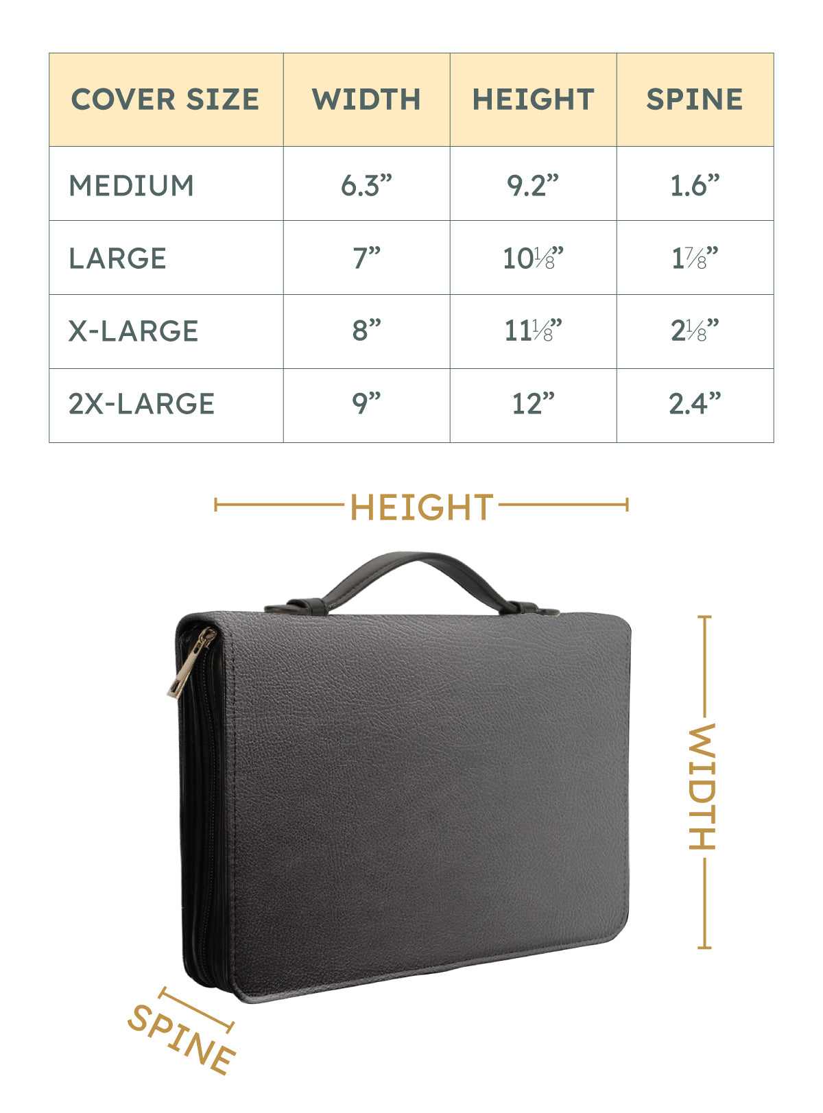 Your cover's dimensions represent its exterior size. To guarantee a perfect fit, measure your Bible accurately and consult our sizing chart. Our covers provide extra room for comfort. Inside, two pen loops keep your writing instruments secure. The interior sleeves tuck into your Bible's front and back covers, ensuring organization.