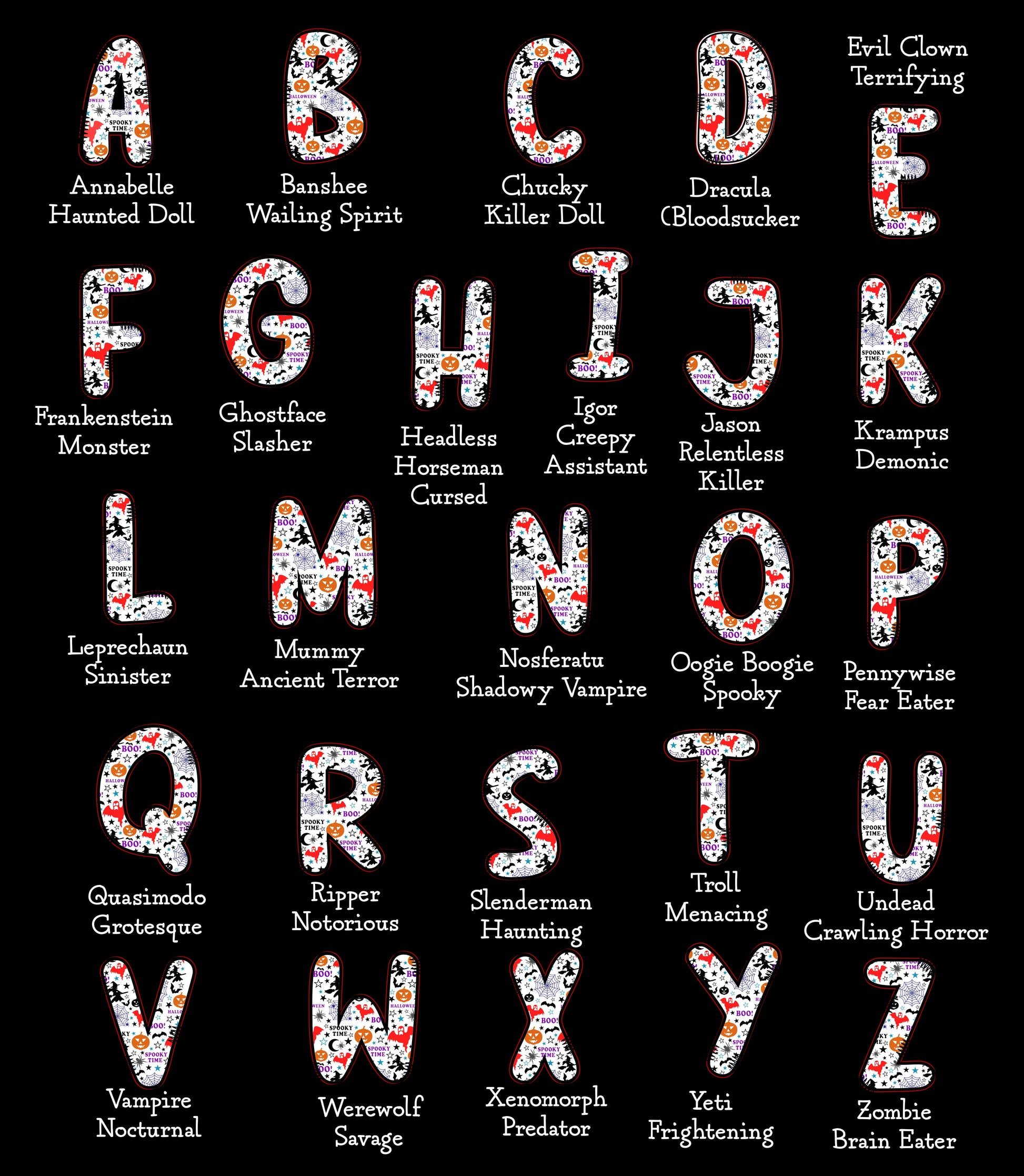 Personalized Halloween Alphabet T-Shirt – Spooky Horror A-Z Characters, Custom Name Graphic Tee