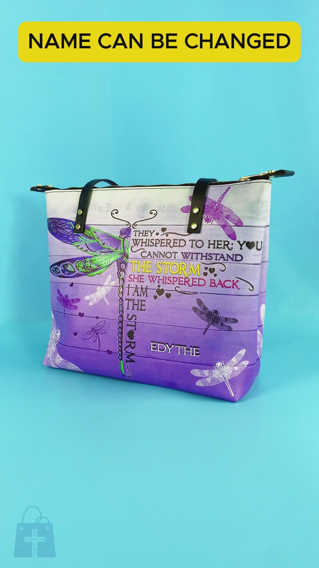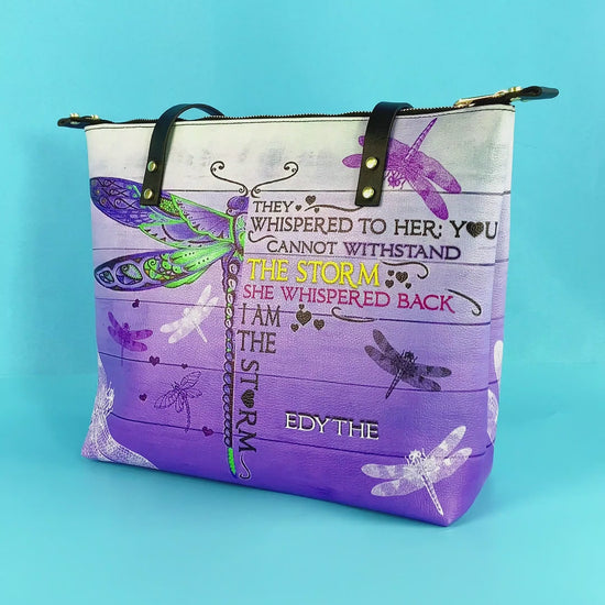 Personalized Leather Tote Bag with Bible Verses – I Am The Storm - Dragonfly | CHRISTIANARTBAG Leather TOTE Bag